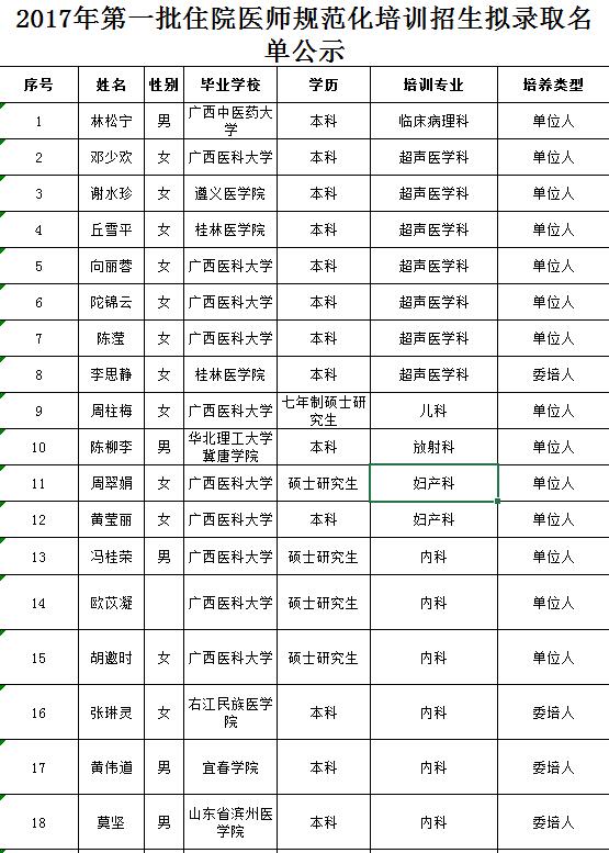 2017年第一批住院医师规范化培训招生拟录取名单公示