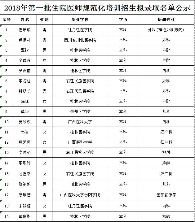 2018年第一批住院医师规范化培训招生拟录取名单公示