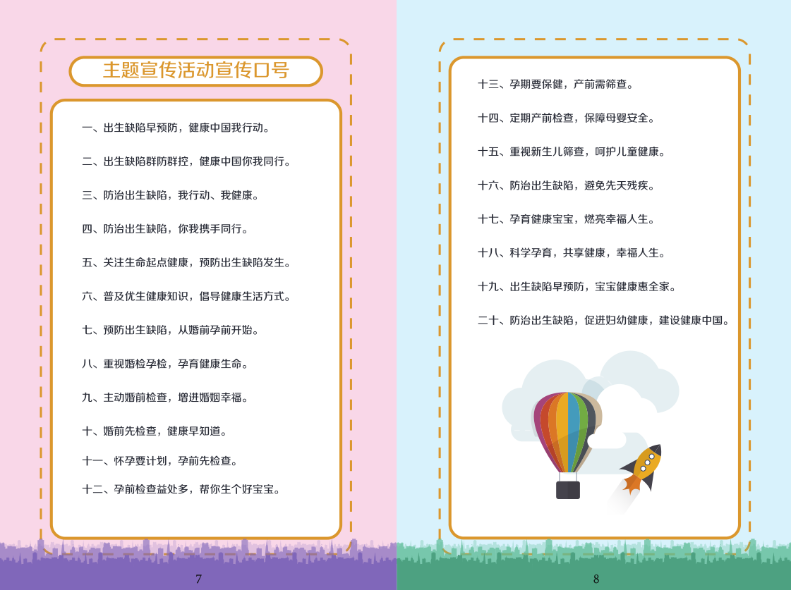 9月12日是“预防出生缺陷日”,今年的活动主题是“同心抗疫,护佑新生”。希望通过弘扬抗疫精神、凝聚奋进力量,统筹推进疫情防控和妇幼健康工作,加强出生缺陷防治知识普及和宣传教育,引导公众主动获取知识、接受服务,科学孕育健康新生命。
