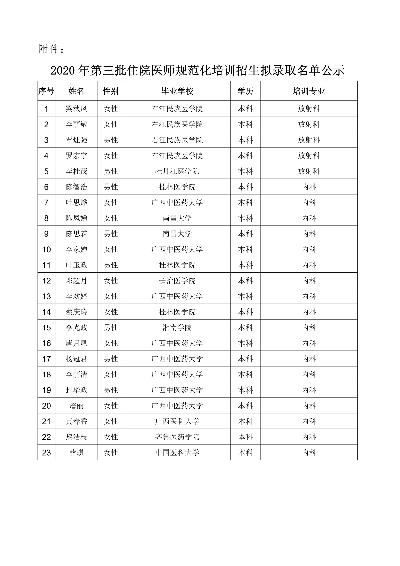 梧州市工人医院关于2020年第三批住院医师规范化培训录取学员公示
