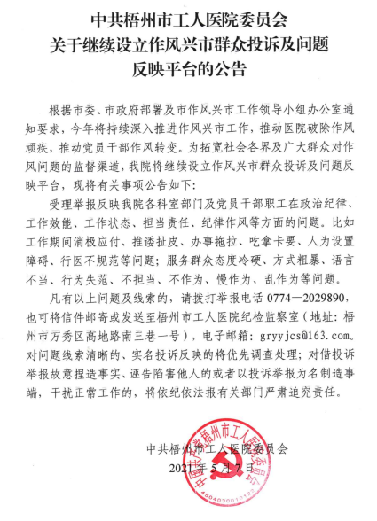 中共梧州市工人医院委员会关于继续设立作风兴市群众投诉及问题反映平台的公告