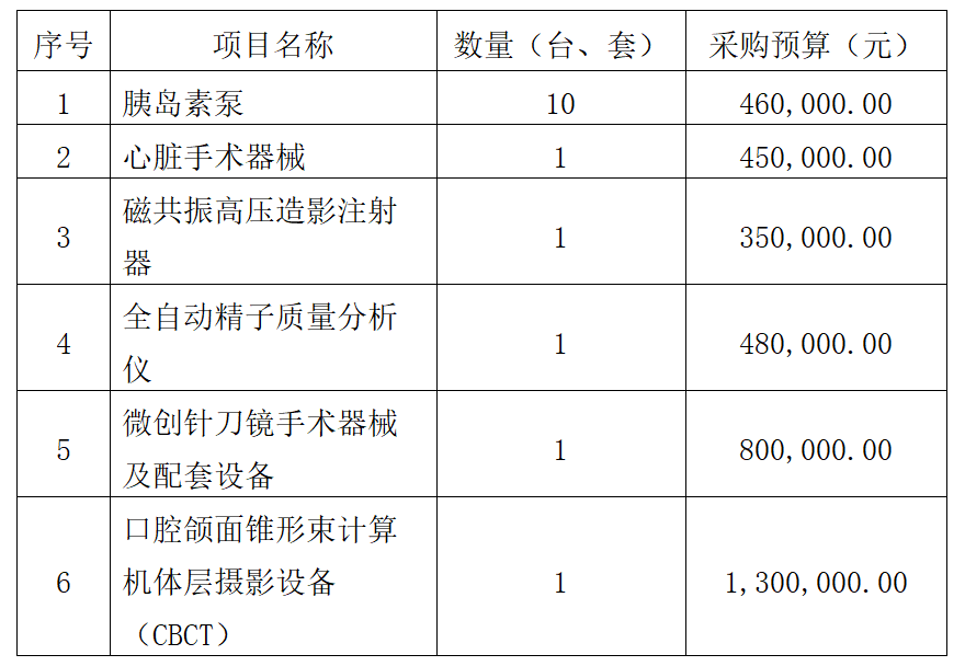 我院拟对胰岛素泵、心脏手术器械、磁共振高压造影注射器、全自动精子质量分析仪、微创针刀镜手术器械及配套、口腔颌面锥形束计算机体层摄影设备(CBCT)进行市场调查,欢迎符合条件的生产厂家(代理公司)前来参加,现将有关事项公告如下: