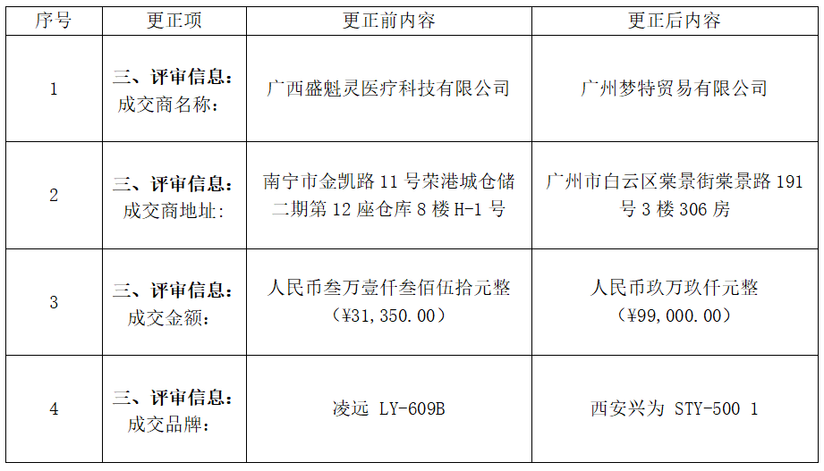 梧州市工人医院红外辐照治疗装置采购评审结果更正公告