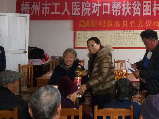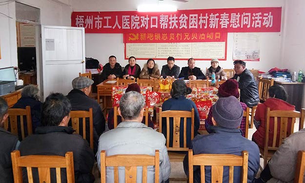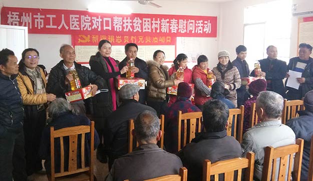 2月8日、9日连续两天,梧州市工人医院派出扶贫小分队分别到苍梧县岭脚镇丰田村、龙圩区新地镇思贤村进行春节走访慰问。